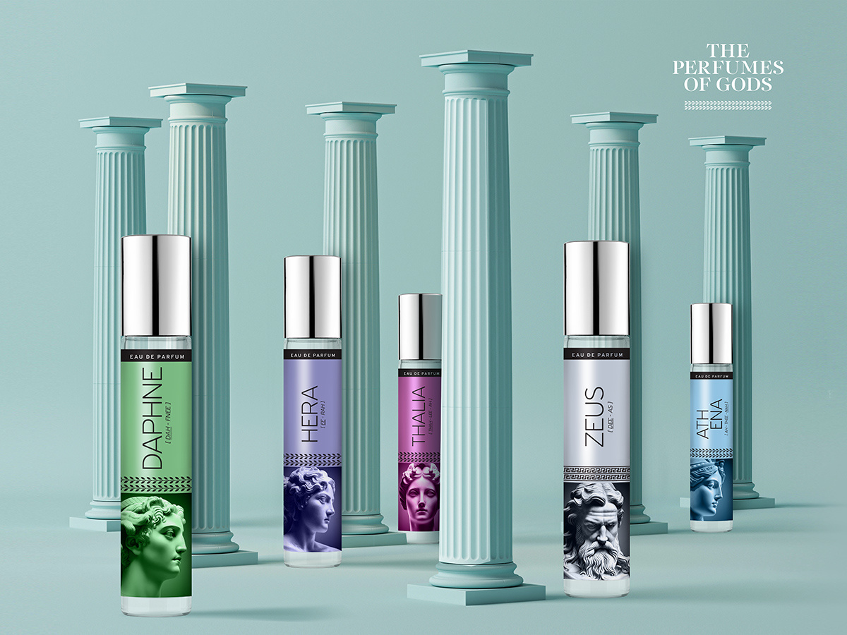 Incorporating this concept, we’ve featured phonetic symbols alongside each fragrance’s name, ensuring international tourists can accurately pronounce and connect with the mythological essence of each scent. The colour palette of the bottles is inspired by the unique traits of each mythological figure, creating a visual language that transforms the divine characteristics of the gods into a vibrant spectrum.