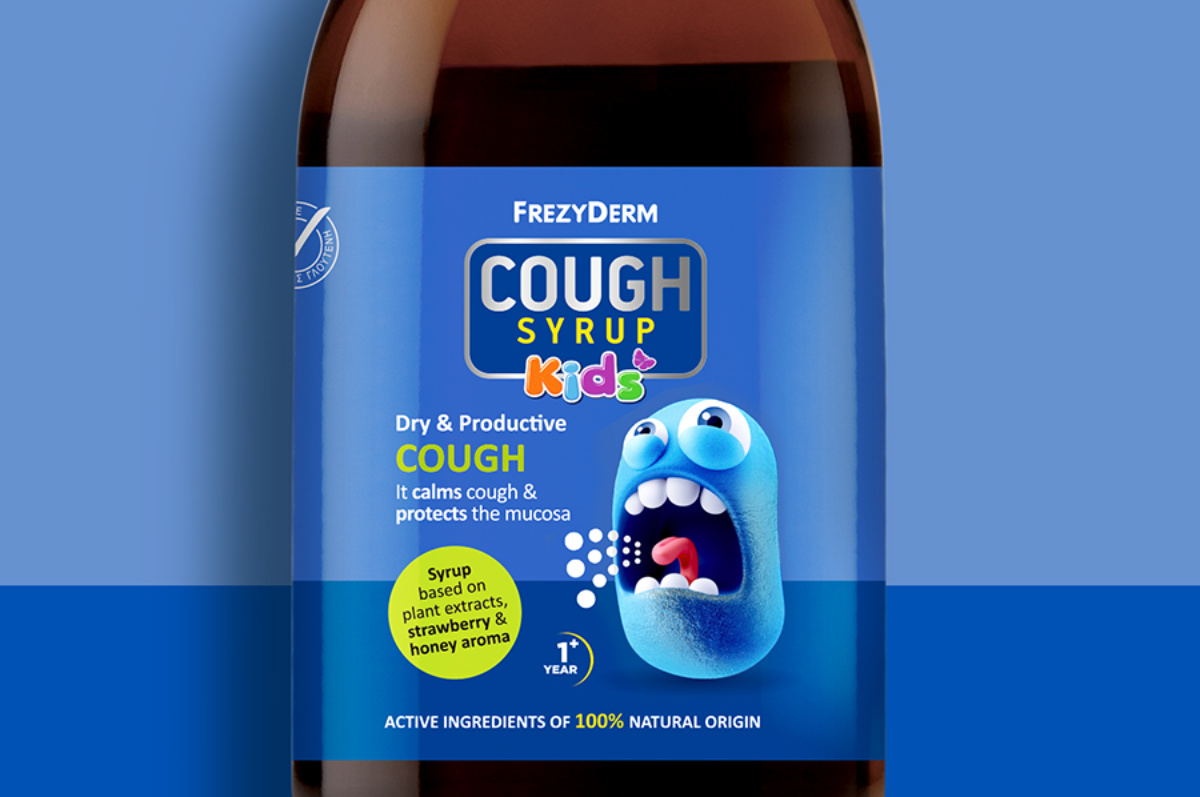 Η δημιουργική πρόκληση ήταν να διαμορφώσουμε μια ετικέτα που θα ξεχωρίζει στην αγορά, επικοινωνώντας ταυτόχρονα την αξιοπιστία της Frezyderm. Χρησιμοποιήσαμε την ιδέα ενός μικρού μπλε ήρωα, για να φέρουμε στο φως τη θεραπευτική φύση του σκευάσματος. Το λογότυπο KIDS, σε χρωματιστή απόδοση, υπογραμμίζει τον τελικό αποδέκτη του προϊόντος, ενώ το σχέδιο του μπλε καρτούν που βήχει προσδίδει μια χιουμοριστική διάσταση, καθιστώντας τον βήχα λιγότερο τρομακτικό για τα παιδιά.