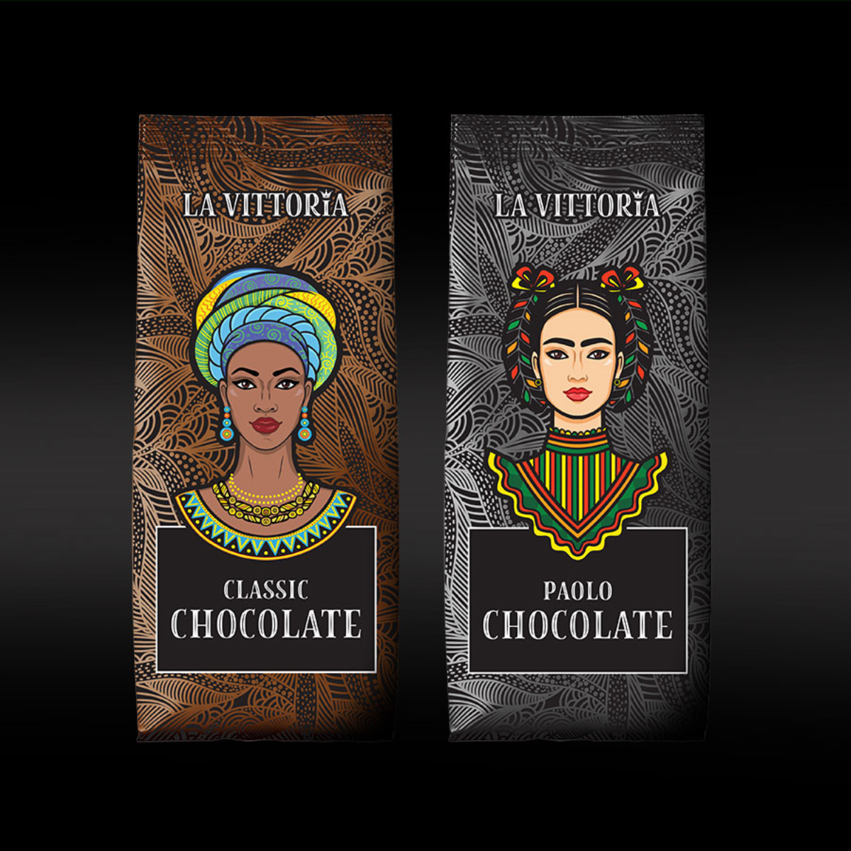 Η Vittorio gourmet espresso αποφάσισε να κυκλοφορήσει στην αγορά χονδρικής δύο μοναδικές γεύσεις εξωτικής σοκολάτας: Classic chocolate και Paolo chocolate. Η δημιουργική μας ομάδα, εμπνευσμένη από τον ethnic χαρακτήρα της σοκολάτας, αποφάσισε να προσθέσει μια έντονα πολιτισμική διάσταση στη συσκευασία, προσκαλώντας τον καταναλωτή σε ένα ταξίδι γεύσης και ανακάλυψης.
